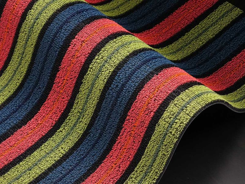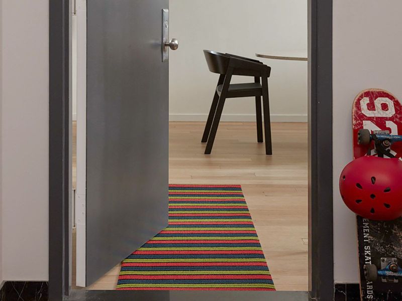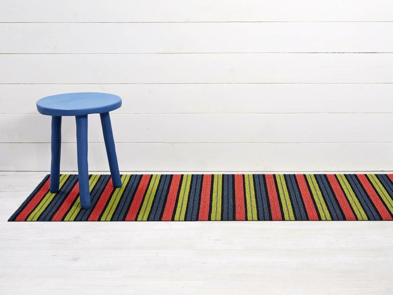 ビビットな赤、青、緑の縞模様はキッチンや玄関を華やかに演出してくれます。屋内と屋外どちらでも使用できます。
